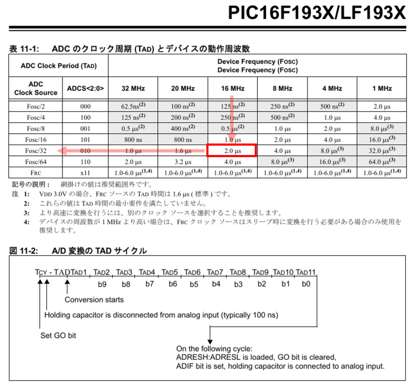 TAD=2.0usに設定、10ビット全体の変換には”11.5×TAD”の時間:23us