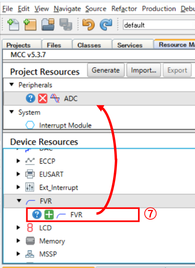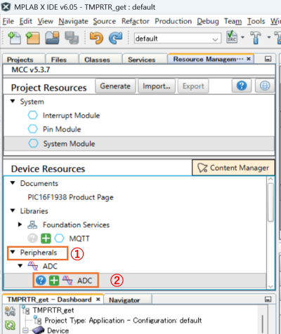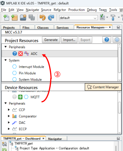 ③:”ADC”が[Project Resources]側に追加されます。