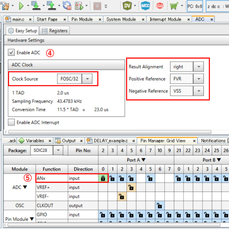 ④:[Enable ADC] “レ” 点、[Clock Source]は、”FOSC/32″を選択。