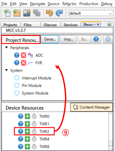 ⑨:[Timer]を左側ボタンダブルクリック、 [TMR2]の “+”を左側ボタンクリック