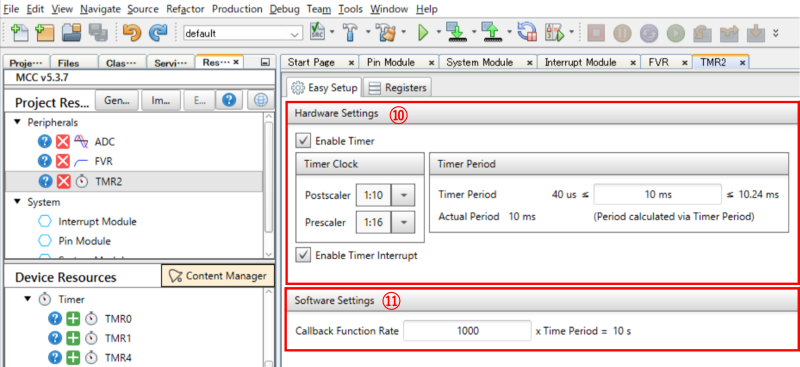 本TMR2モジュールは、ハード設定による割り込み(10ms 毎)と この割り込みを1000回処理するプログラム(10sタイマー)を ”Software Settings” 設定により自動で生成します。