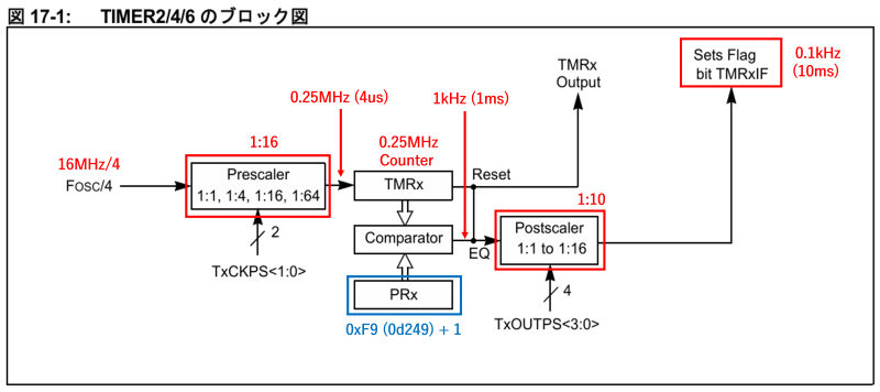 Sets Flag bit TMxIFの周期=1/ ( FOSC/4 ) × Prescaler × ( PRx+1 ) × Postscaler