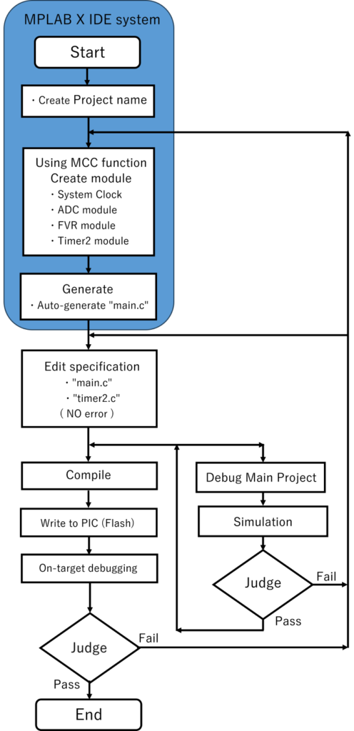 ”MPLAB X IDE”支援ソフトは、ソフト設計に関する PICマイコンやC言語について詳細に理解していなくても、プログラム作成、ソフト上の検証、プログラムのコンパイル、マイコンへの書き込み、実機の検証ができます。