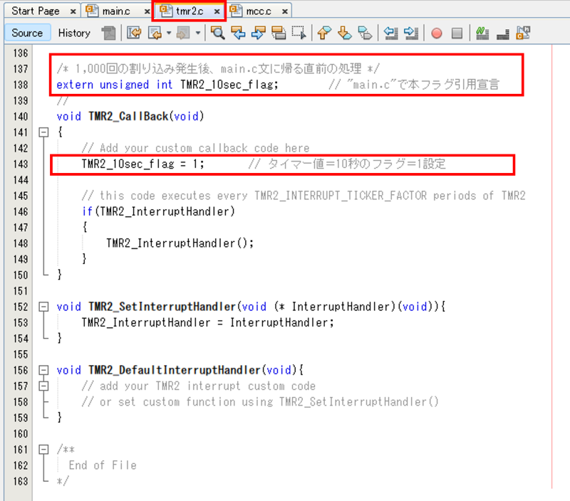 注意:MCC機能を使い自動生成したプログラム( tmr2.c )を直接編集した場合、プログラムが新しく再生成(”Generate”の実行)されるため、ここで編集したプログラムは残っていません。