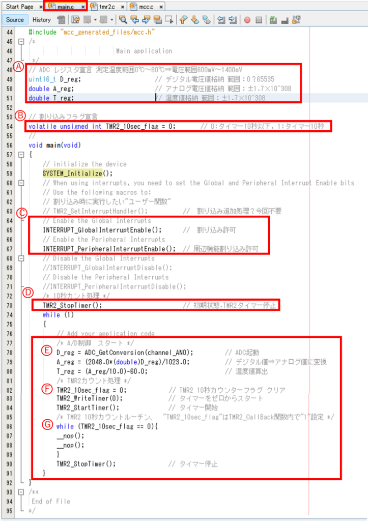 システム初期設定、TMR2の割り込み許可と初期化 - ADC_GetConversion、Temperature calculation、TMR2_10sec_flag “0” set、
