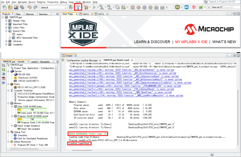 MPLAB X IDE画面の上部赤枠( ハンマーの形:Build Main Project )をマウス左ボタンクリック