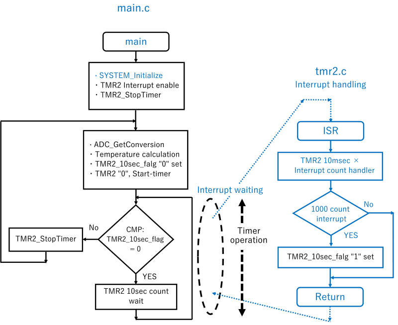 図2:main.c, tmr2.cのプログラム編集フローチャートの main.c プログラムです。