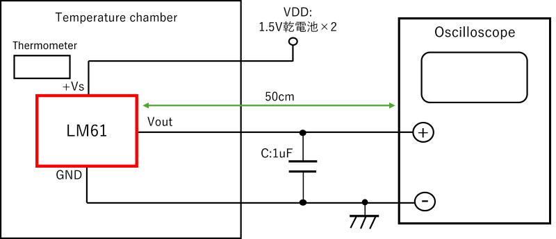 LM61のVout出力接続の単線の長は、50cm。