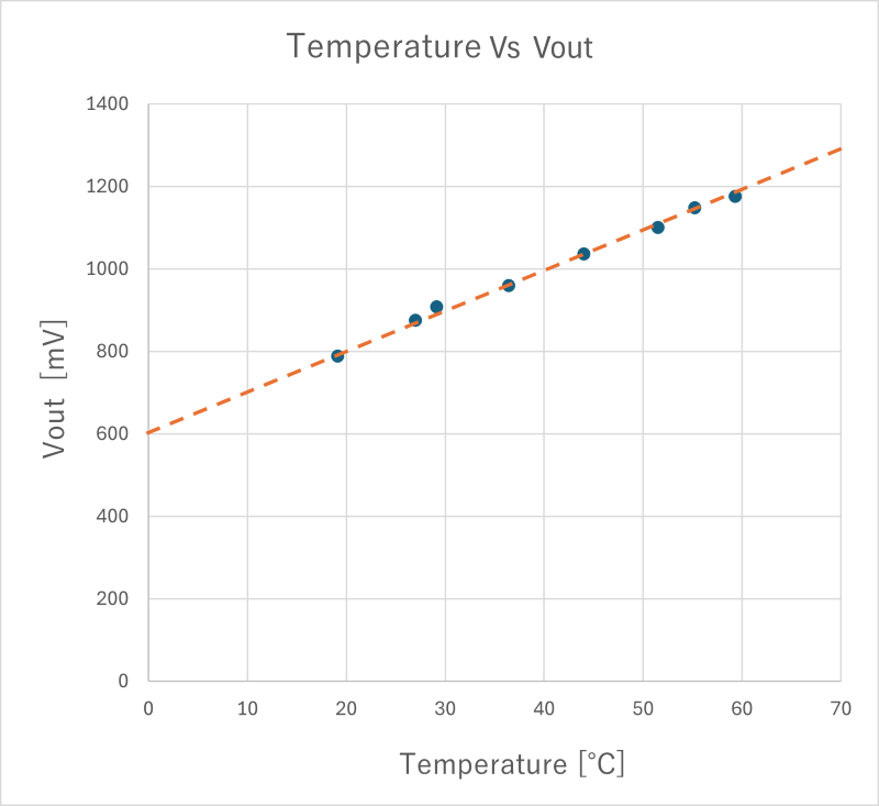 ”Vout出力電圧【mV】=10【mV/℃】× 温度【℃】+ 600【mV】”に準じるかの評価しました。